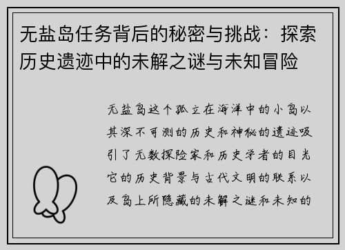 无盐岛任务背后的秘密与挑战:探索历史遗迹中的未解之谜与未知冒险