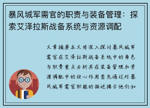 暴风城军需官的职责与装备管理:探索艾泽拉斯战备系统与资源调配